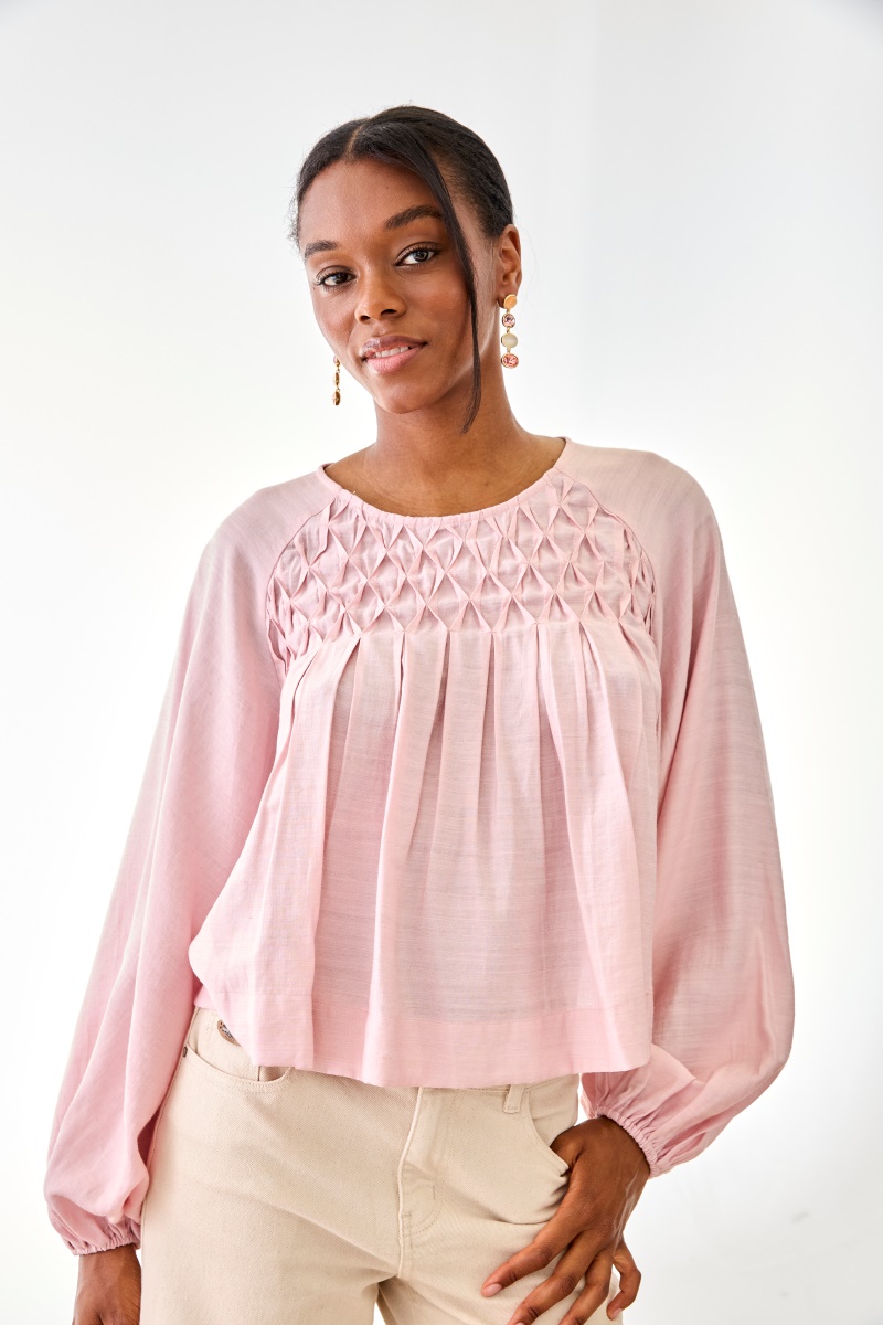 NKN Nekane blouse with geometric pleated yoke, puff sleeves and a soft, flowy drape in blush pink. Discover it at Mireia’s Dream.