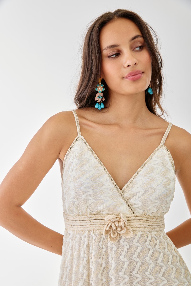 The waist is enhanced with a braided belt finished with a decorative flower, adding an artisanal and feminine touch.