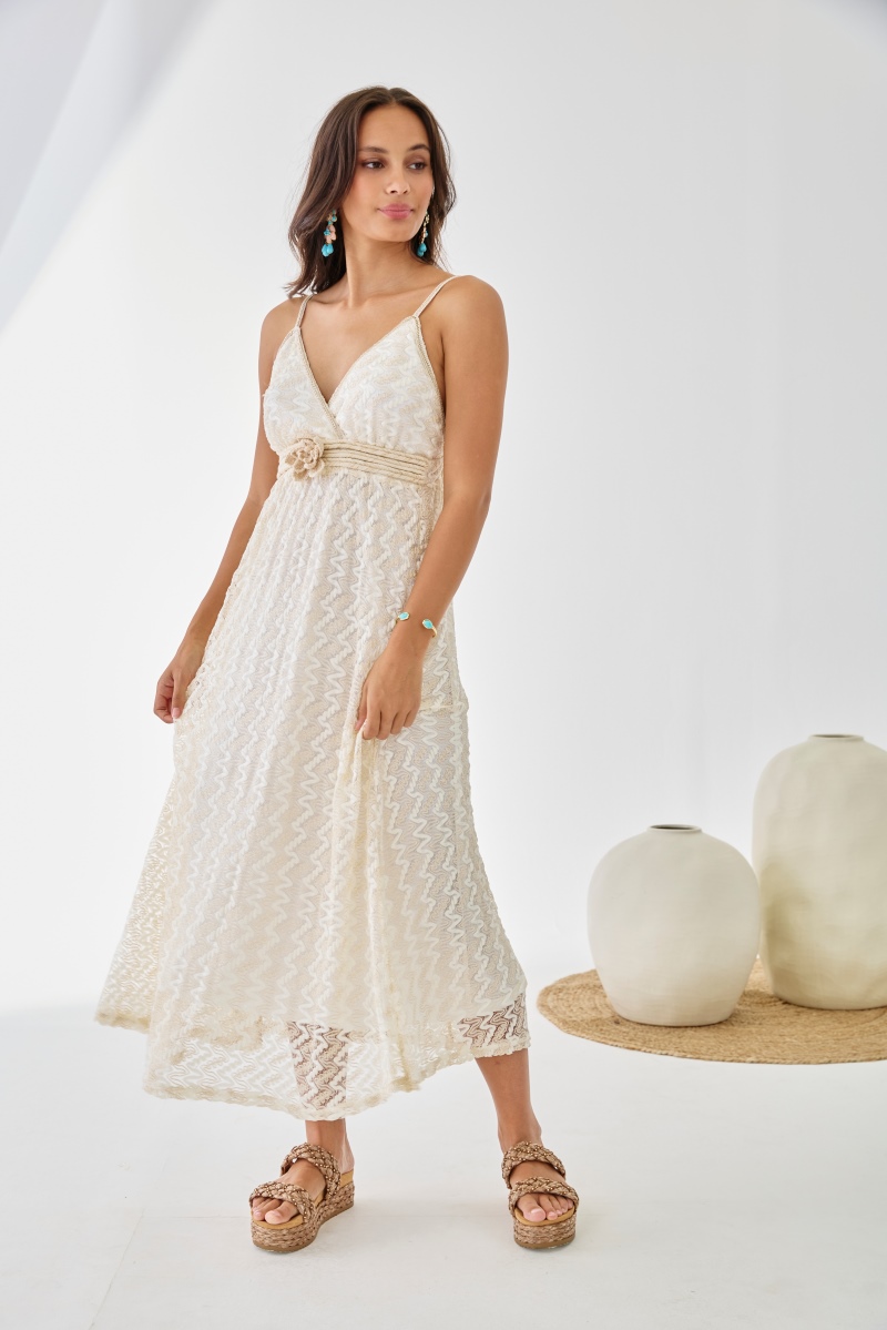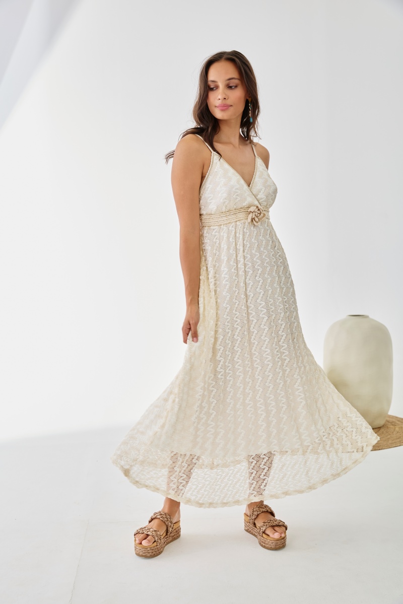 Long NKN Nekane dress in cream floral lace, featuring a V‑neckline, thin straps and a braided belt. Boho elegance.