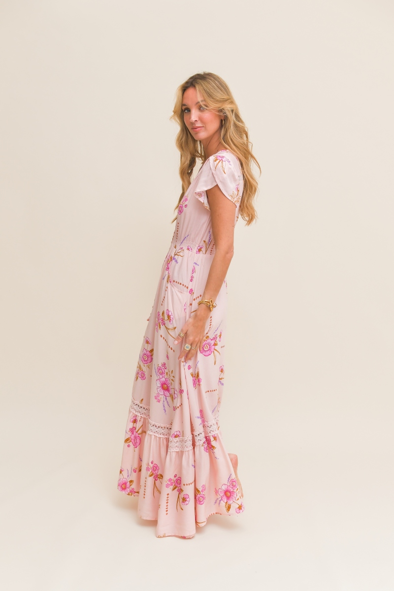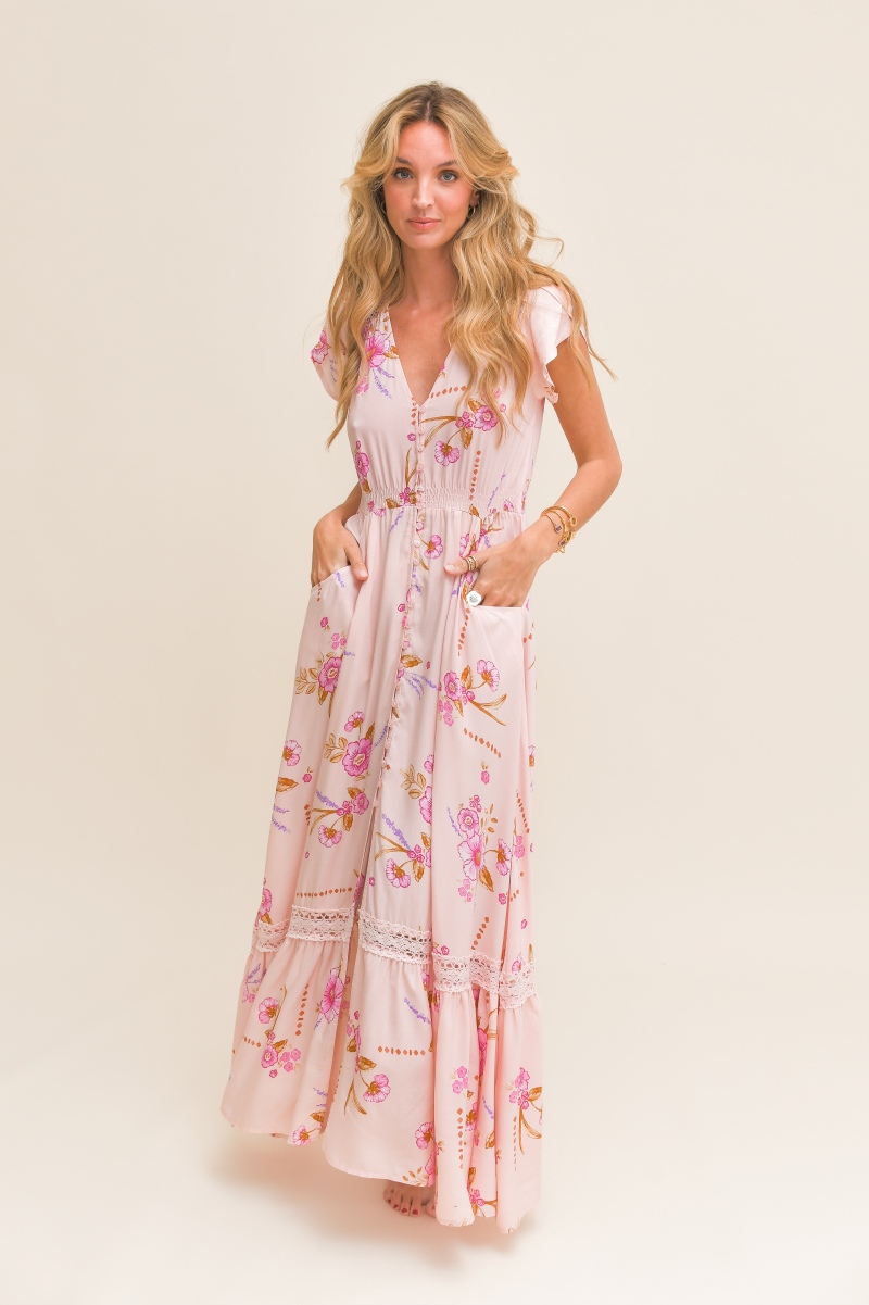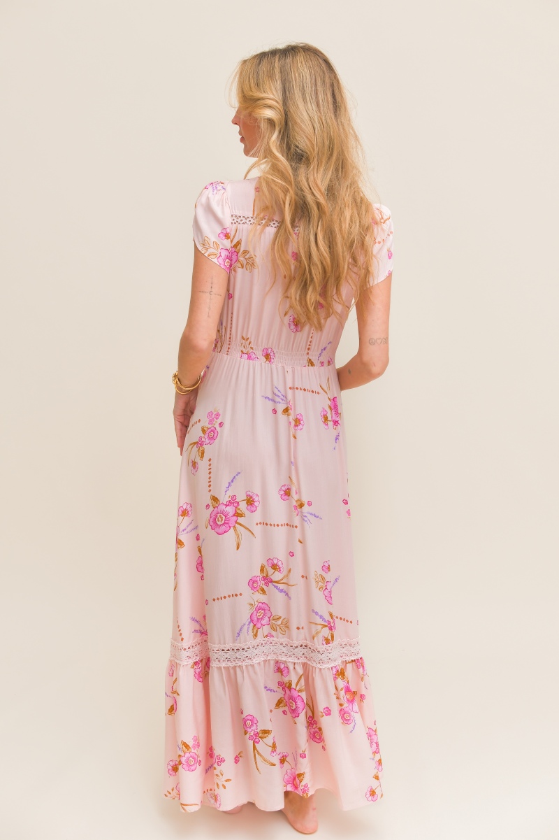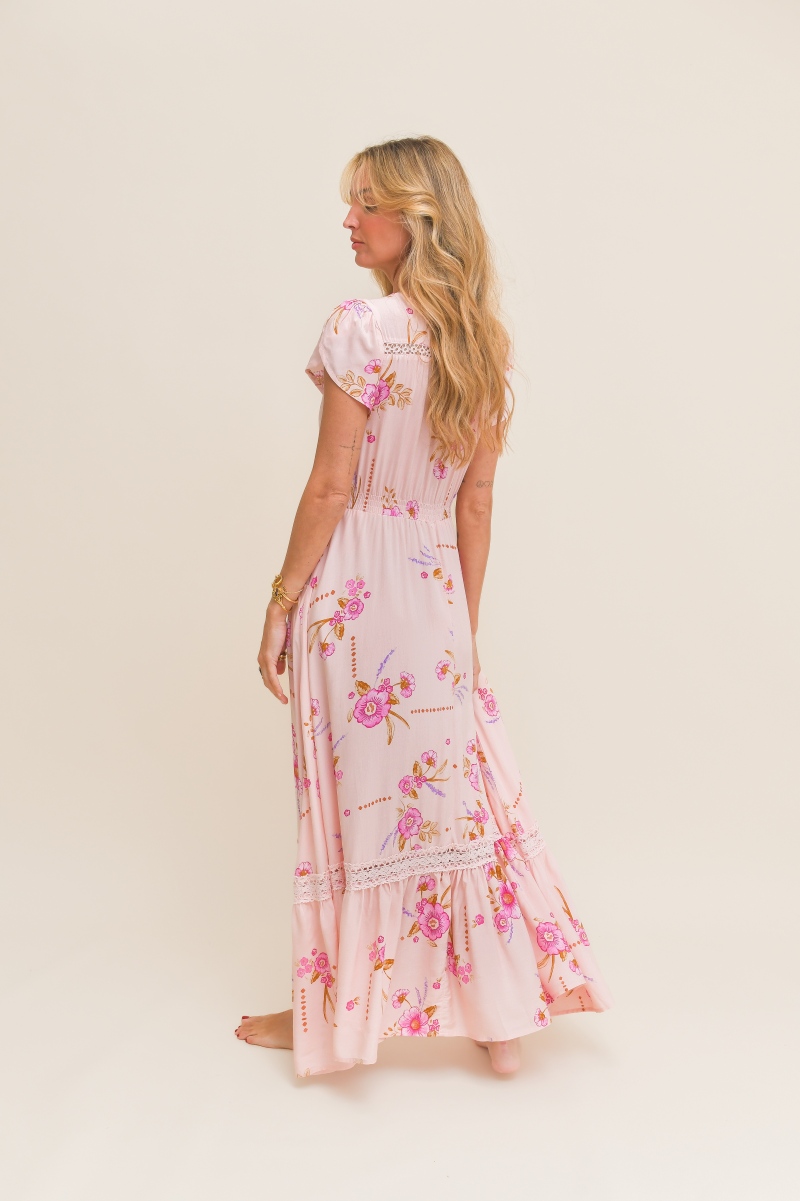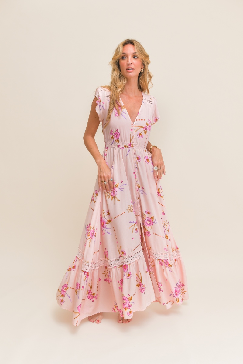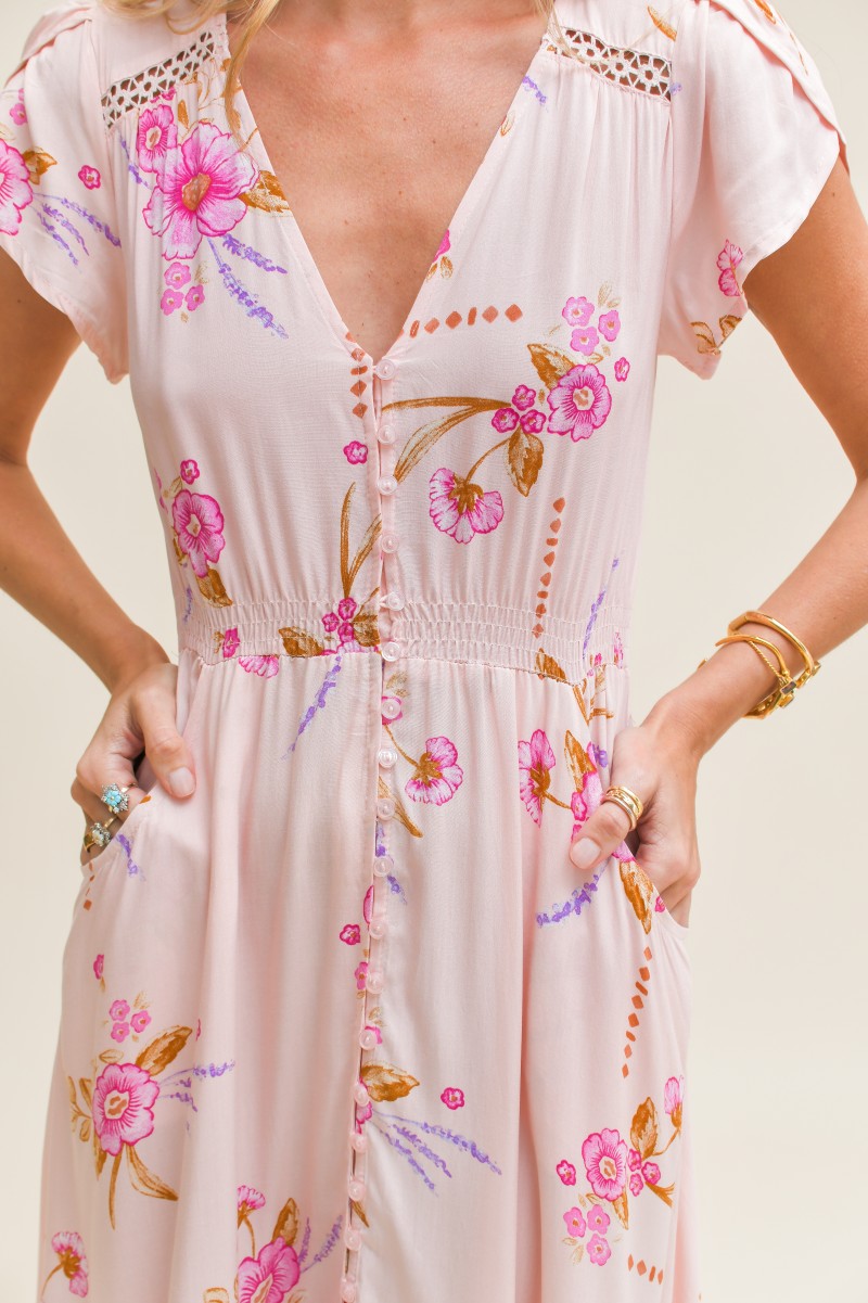 Jaase Carmen dress in the “Blushing Fields” print, with V‑neckline, button front, smocked waist and lace‑trim skirt. A soft, romantic boho style.