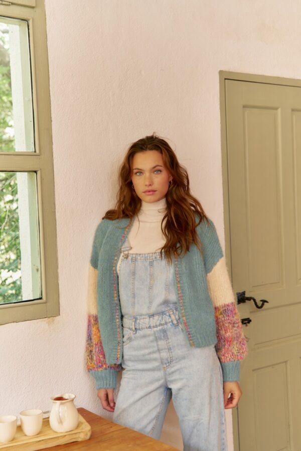Boho cardigan in smooth wool knit with blue and off-white tones. A Jaase design, warm and buttonless.