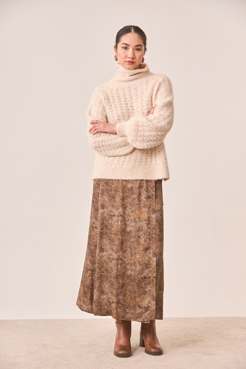 Boho sweater in cable knit, high neckline, and long puff sleeves in off-white.