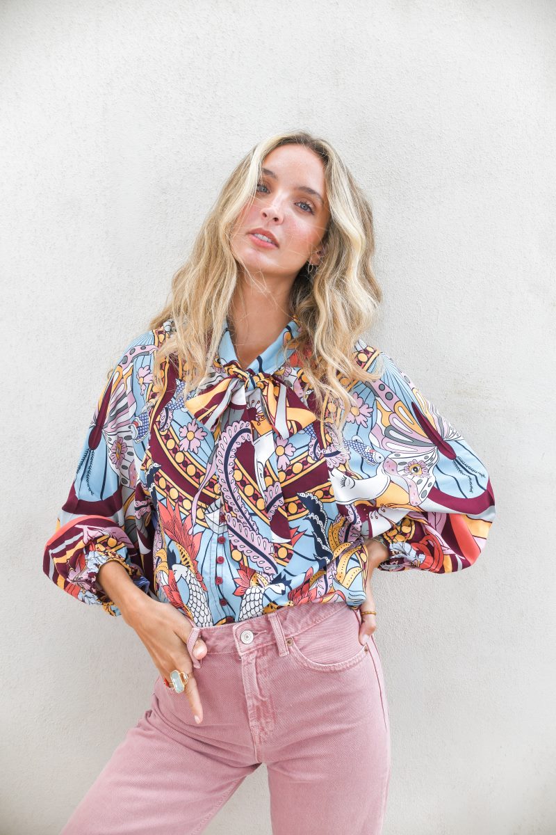 La blusa Imogen de Jaase destaca por su estilo boho vibrante y su precioso estampado Wild Hearts, una mezcla de tonos azul, burdeos, mostaza, rosa y blanco que aporta un aire artístico y muy especial.