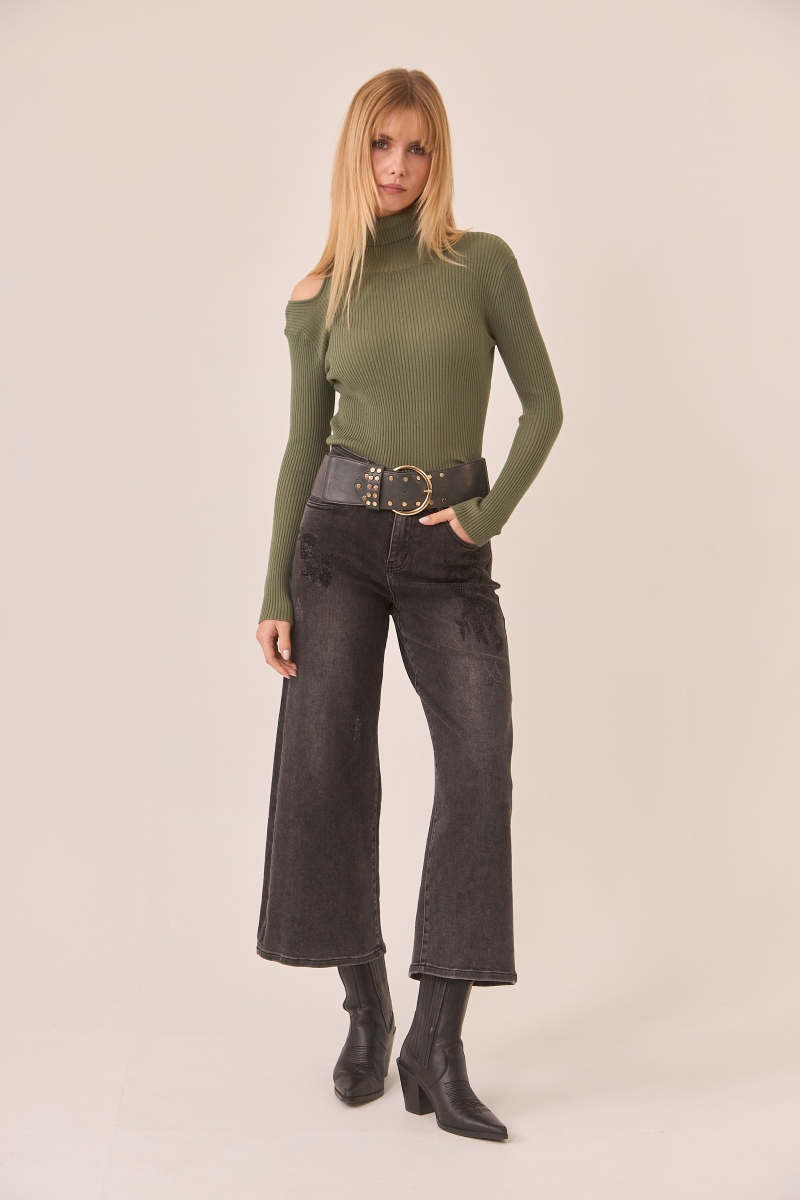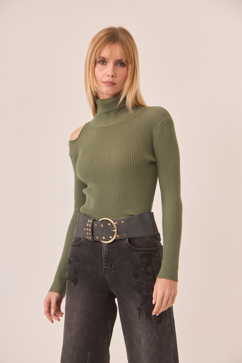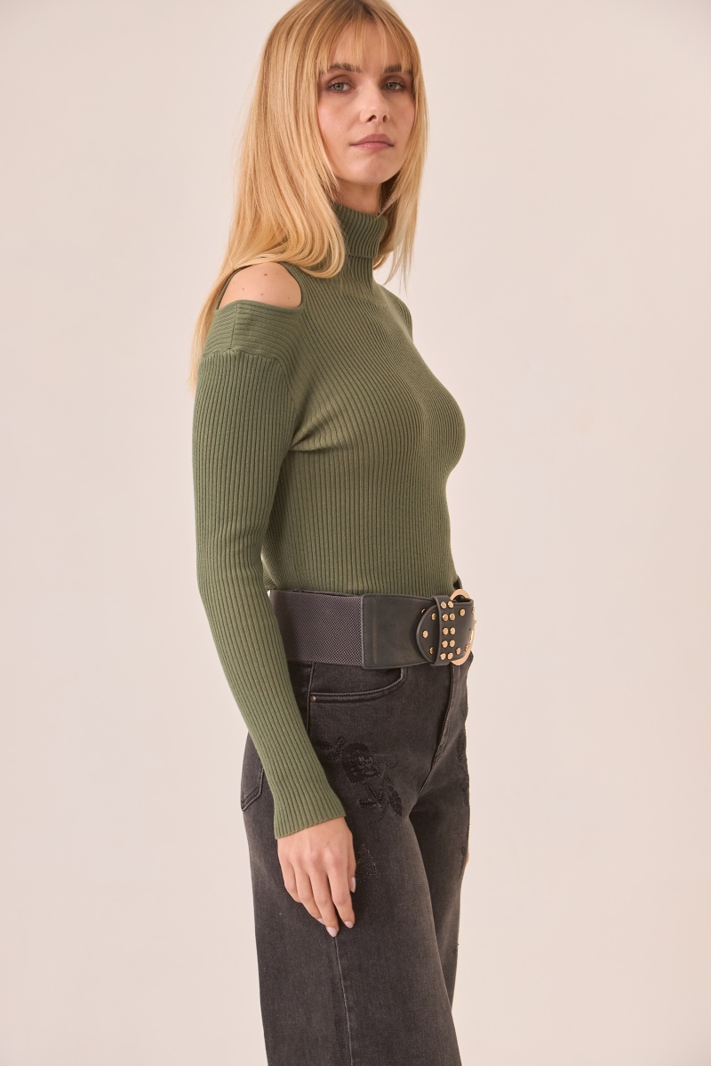 Jersey de canalé de la marca española Nekane ajustado con cuello alto, detalle cut out en el hombro y color caqui.