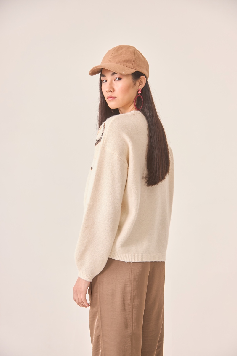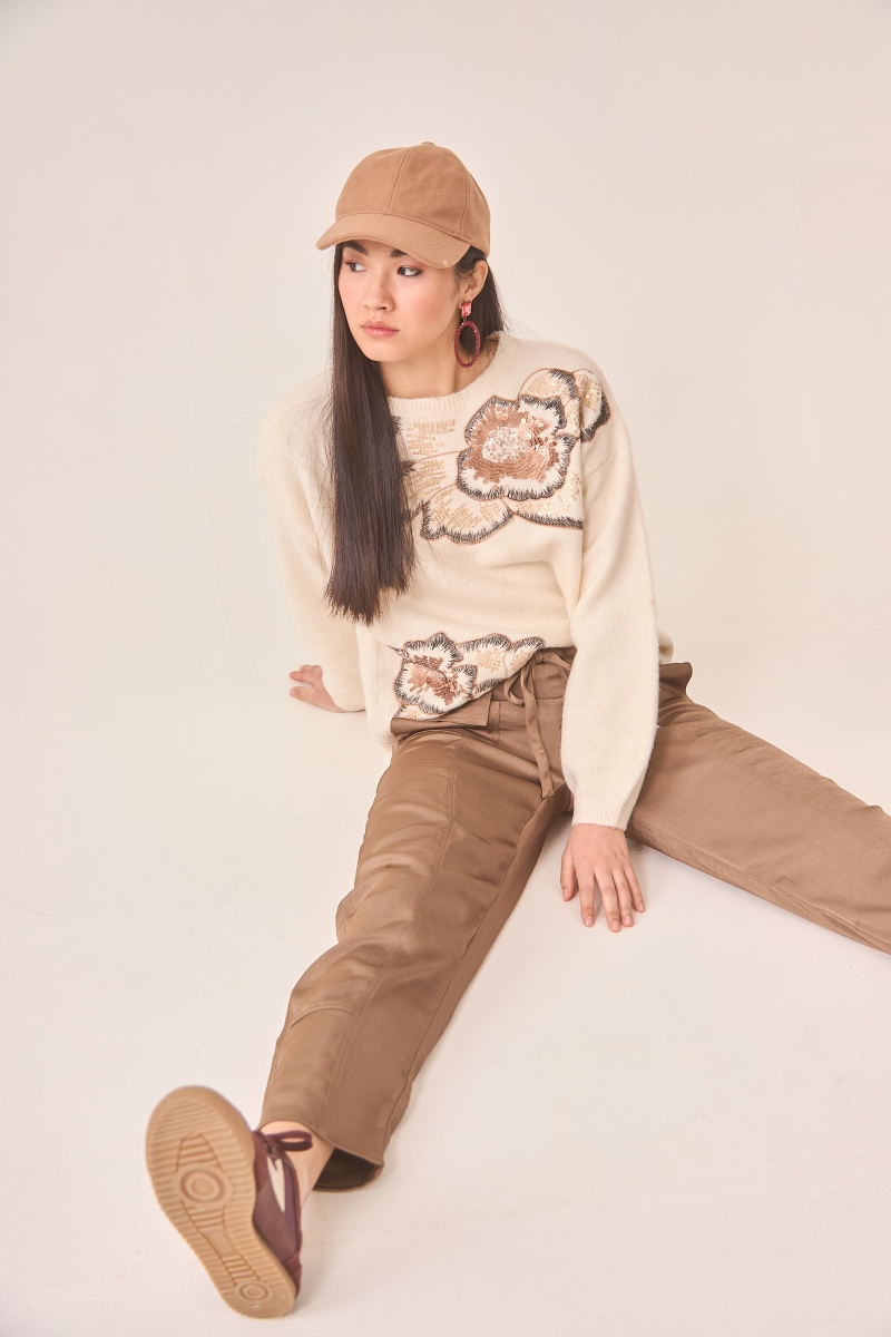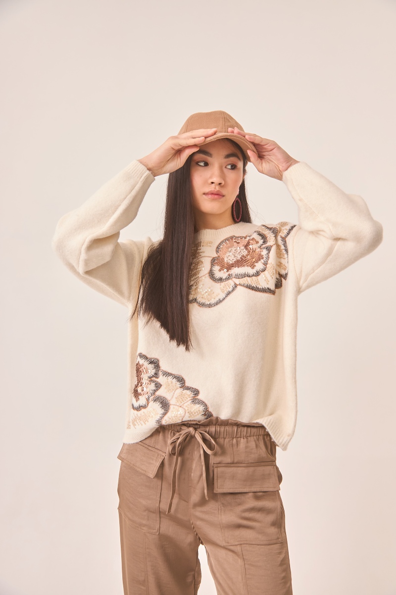 Jersey marfil de NKN Nekane con delicado motivo floral de lentejuelas en el frontal, un estilo suave y luminoso para tus looks.