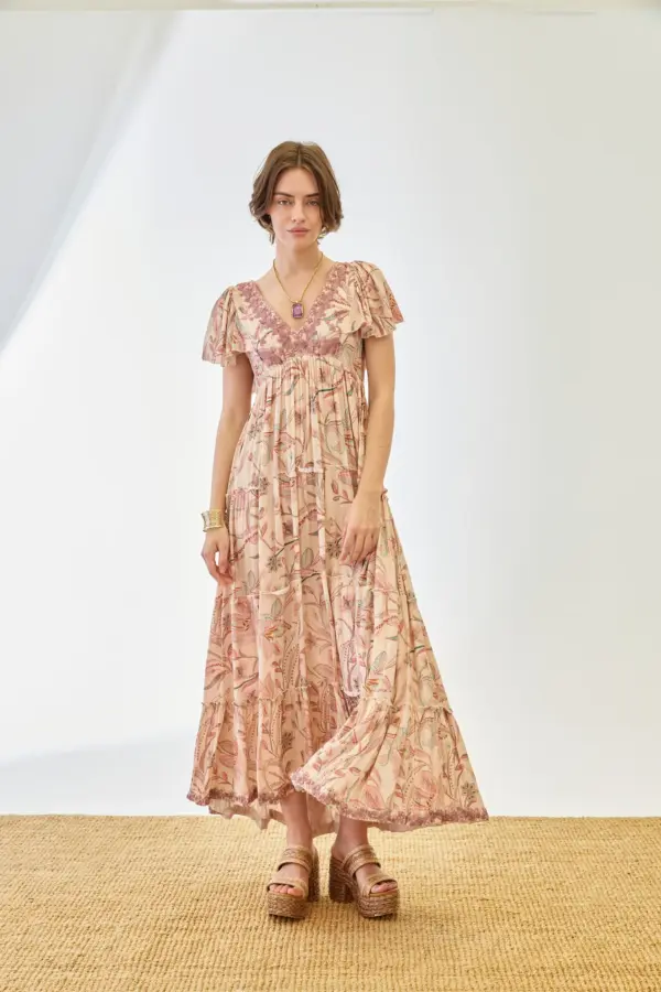- Detalles: Escote en V con bordado, manga corta volante, estampado floral, falda fluida